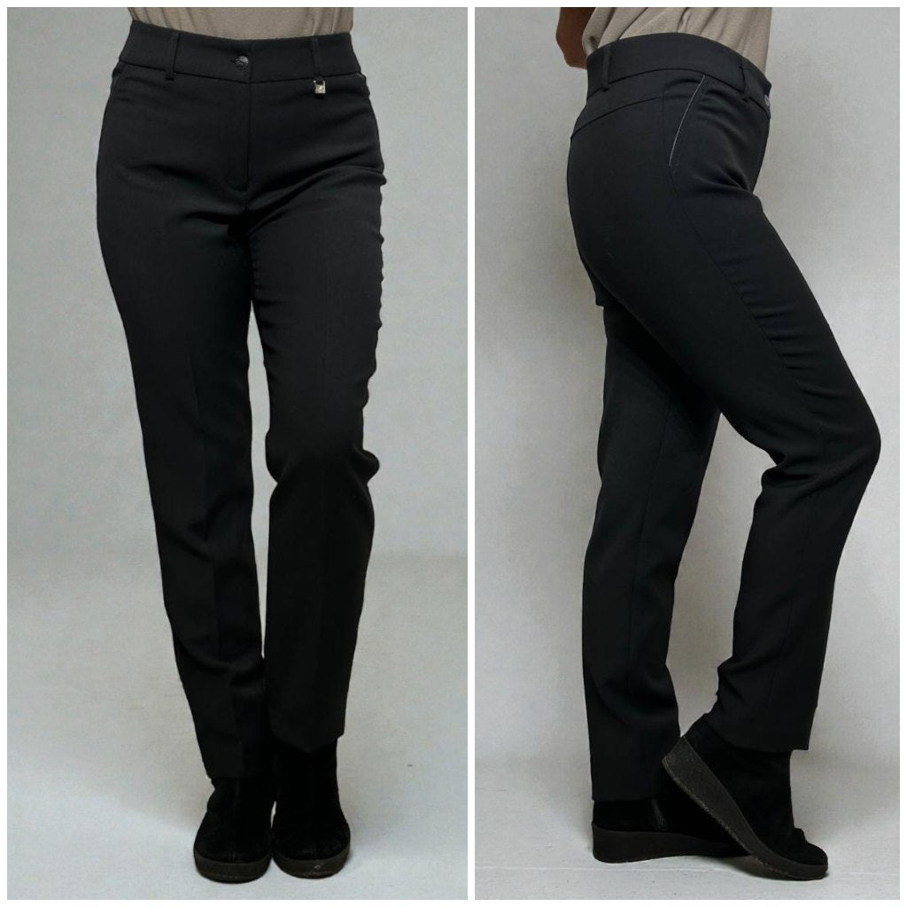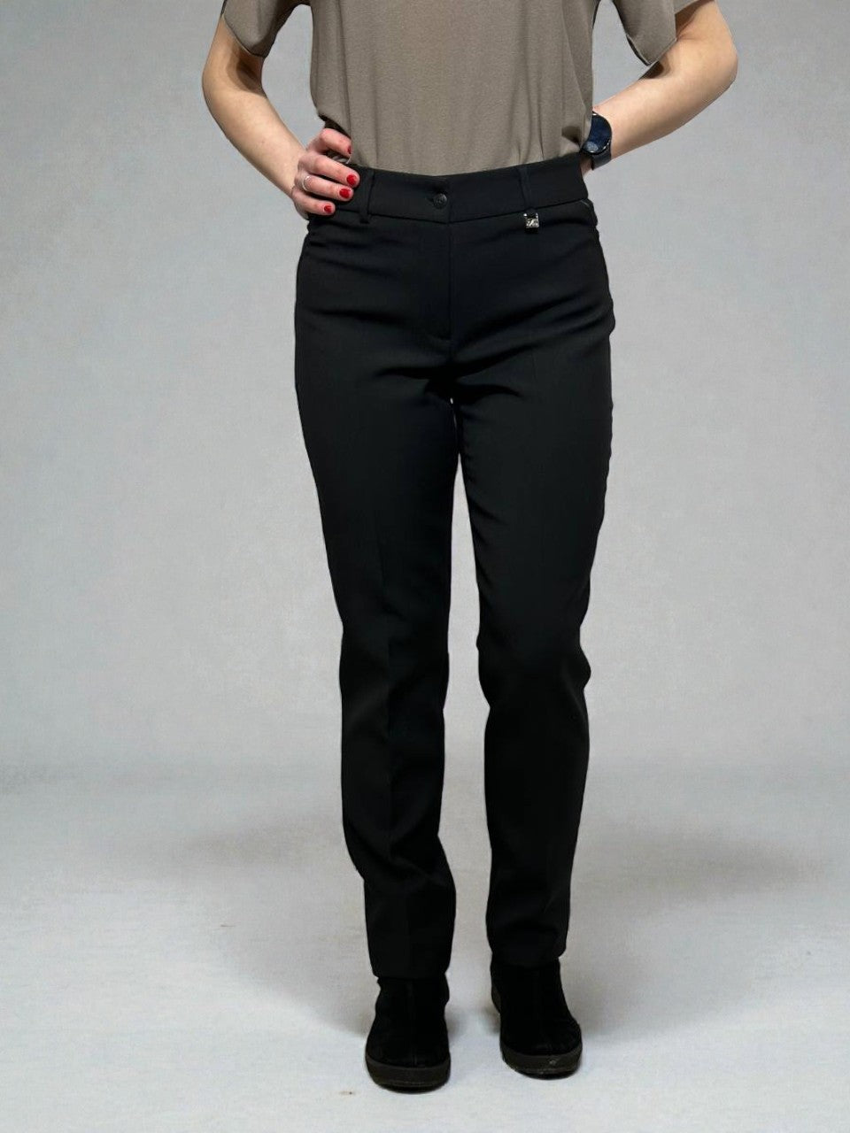 Classic black pants, slightly tapered at the ends, with a medium-high waist that ensures a comfortable and neat fit. The smooth fabric fits well and maintains its shape throughout the day. A versatile model suitable for both everyday wear and an elegant look.
