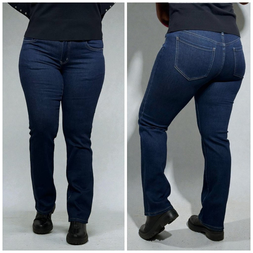 Long, straight cut dark blue jeans for women are an elegant and versatile wardrobe element, featuring a classic silhouette and easily combined with both casual and more formal looks.