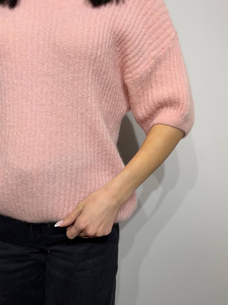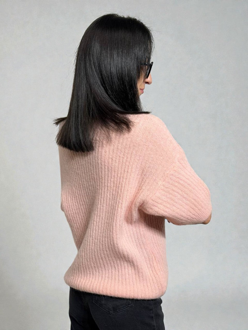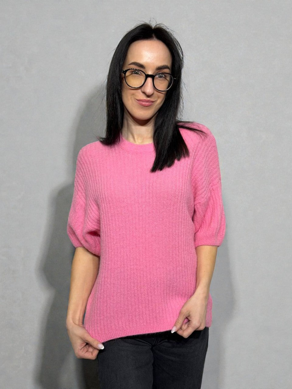 Maigs un ērts rozā rievots adīts džemperis ar 3/4 piedurknēm. Sievišķīgs siluets, patīkams materiāls un universāls dizains, kas lieliski der gan ikdienai, gan elegantākam tēlam. Viegli kombinējams ar džinsiem, svārkiem vai biksēm.