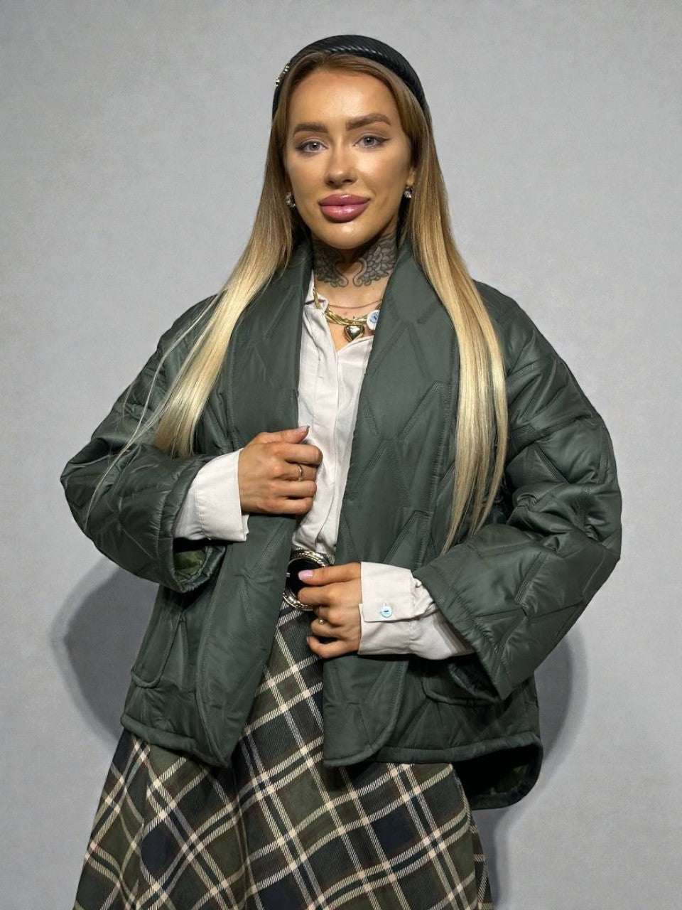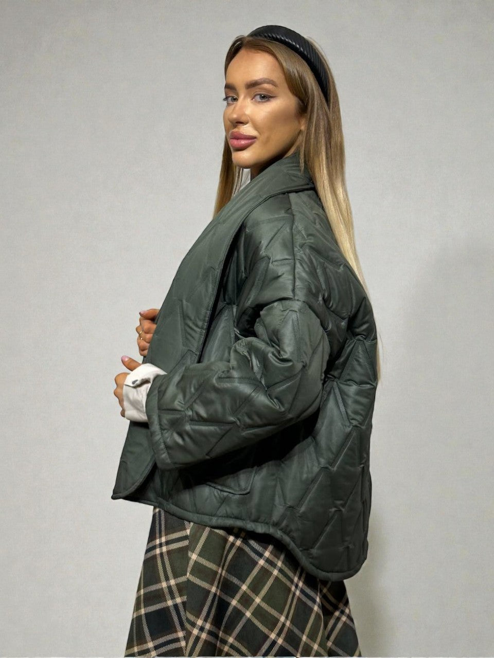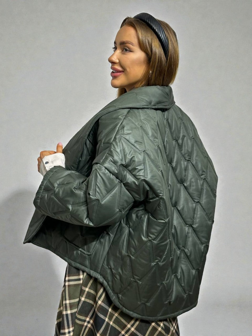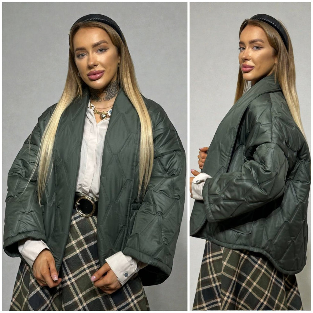 Eleganti ir šilta haki krāsas virsjaka, kas apvieno komfortu ar sievišķīgu siluetu. Stilīga un praktiska izvēle rudenim un ziemai — viegla, ērta un vizuāli pievilcīga.