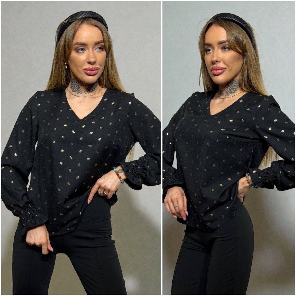 Eleganta sieviešu blūze melnā krāsā ar smalku zeltainu rakstu, kas piešķir koptēlam izsmalcinātu akcentu. V veida kakla izgriezums vizuāli pagarina kakla līniju, savukārt brīvais piegriezums nodrošina komfortu ikdienas valkāšanā. Garās piedurknes ar savilkumu aprocēs rada sievišķīgu un modernu siluetu.