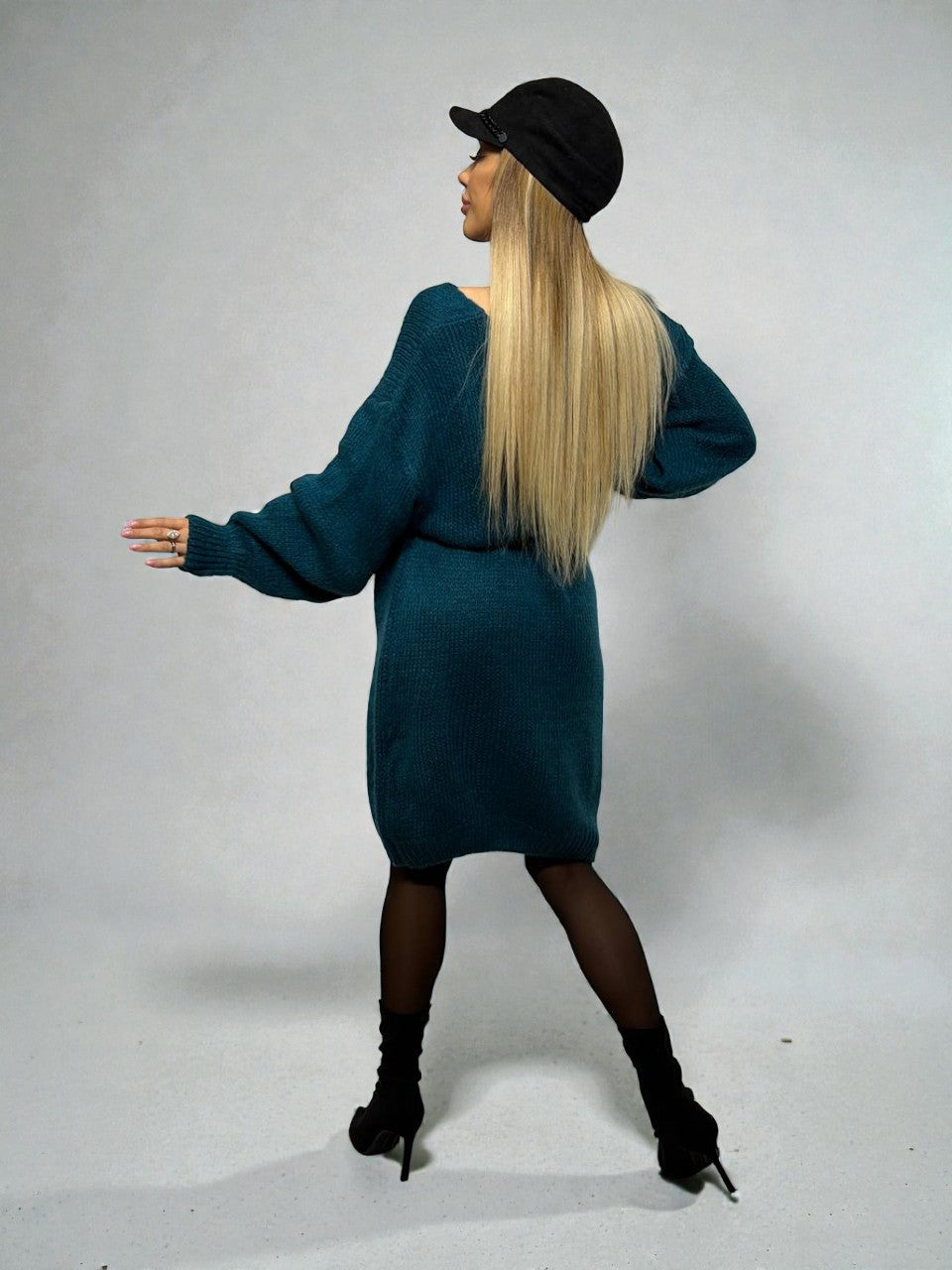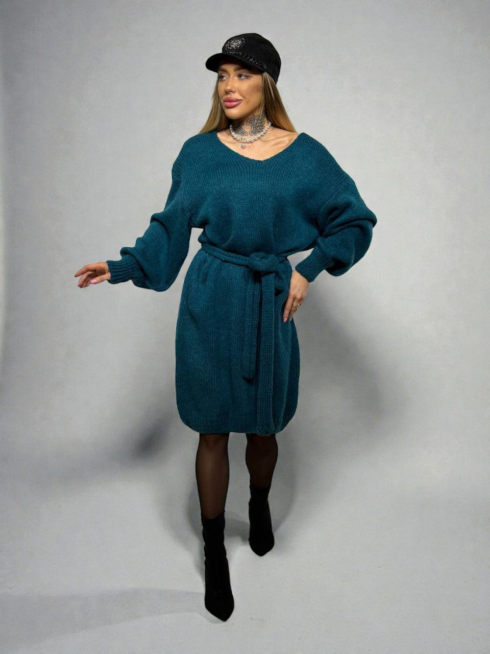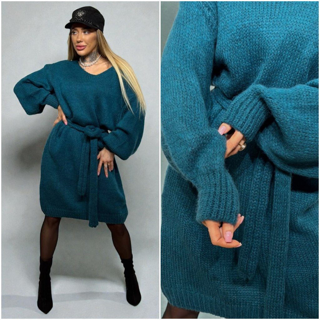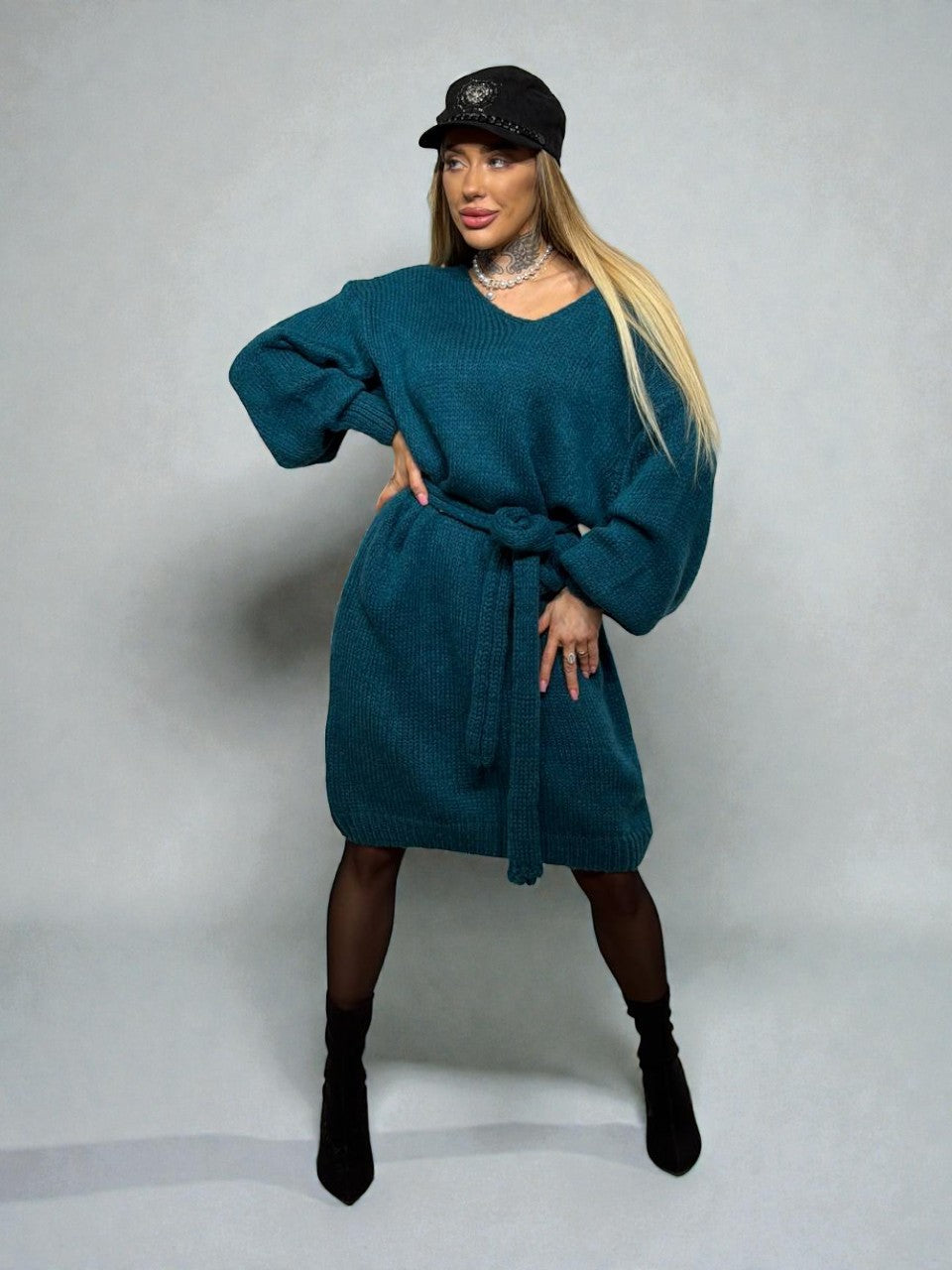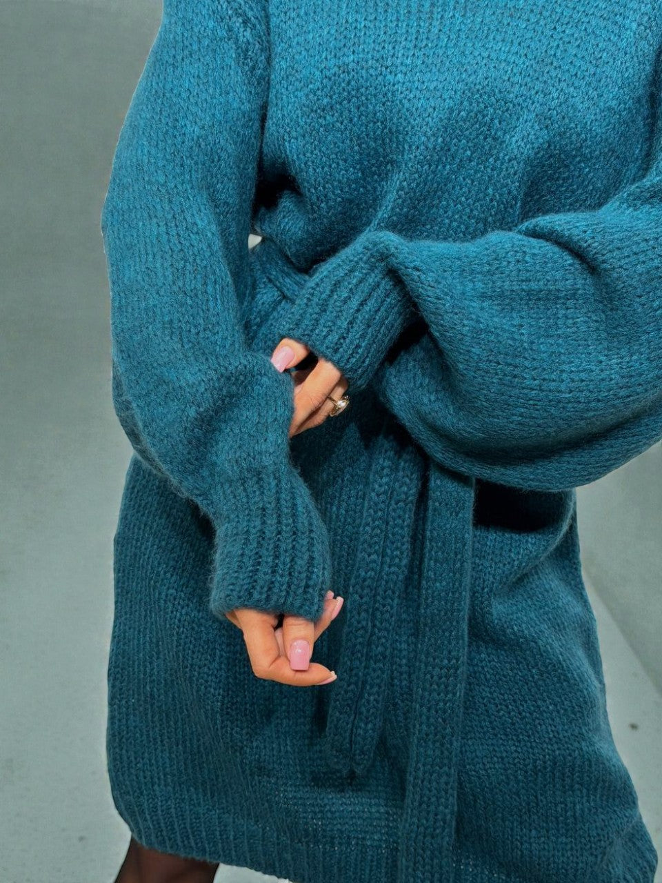 Brīvā piegriezuma adīta džemperkleita ar balonveida piedurkņu galiem un izteiksmīgu kakla izgriezumu veido modernu, vienlaikus sievišķīgu siluetu. Josta viduklī ļauj izcelt vidukli. Mīkstais, sildošais adījums nodrošina ērtu valkāšanu visas dienas garumā.