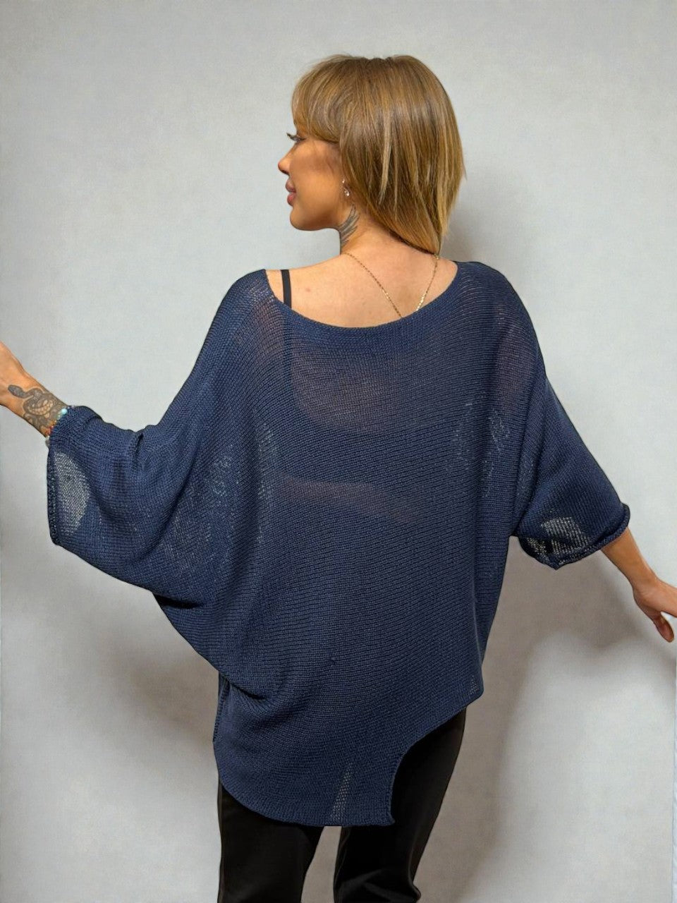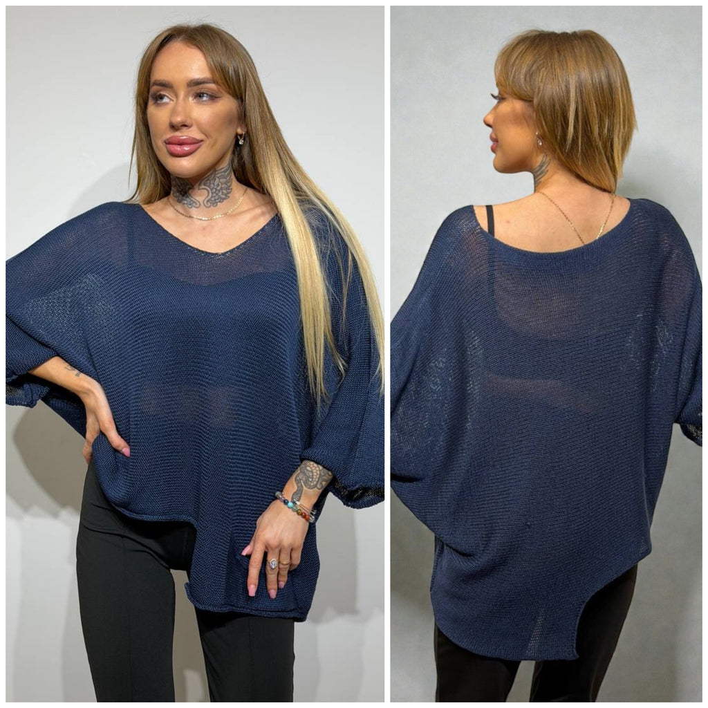 Brīva piegriezuma adīts džemperis tumši zilā tonī ir ideāla izvēle komfortam un stilam ikdienā. Tā vieglais, elpojošais materiāls nodrošina patīkamu sajūtu visas dienas garumā, savukārt modernais siluets piešķir tēlam nepiespiestu eleganci.