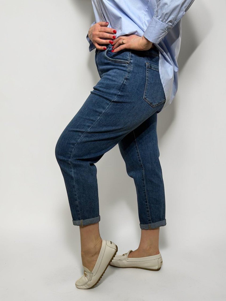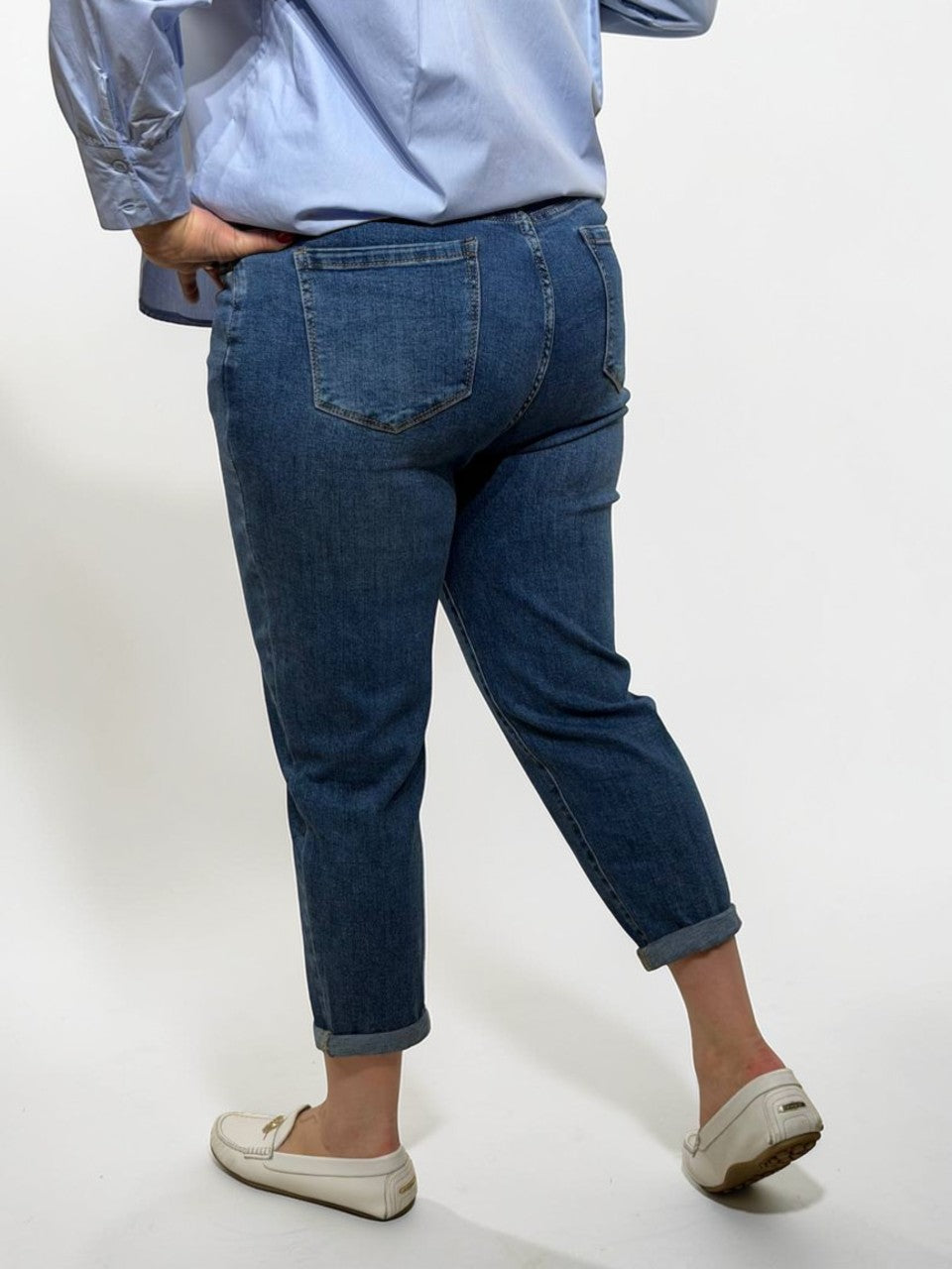 Ērti un sievišķīgi zili džinsi, kas apvieno klasisku dizainu ar maksimālu komfortu. Šis modelis veidots ar augsto jostasvietu, kas skaisti akcentē vidukli un nodrošina patīkamu, stabilu piegulumu, nedaudz sašaurinātās staras ar atlocītu apakšmalu piešķir modernu un viegli kombinējamu izskatu.