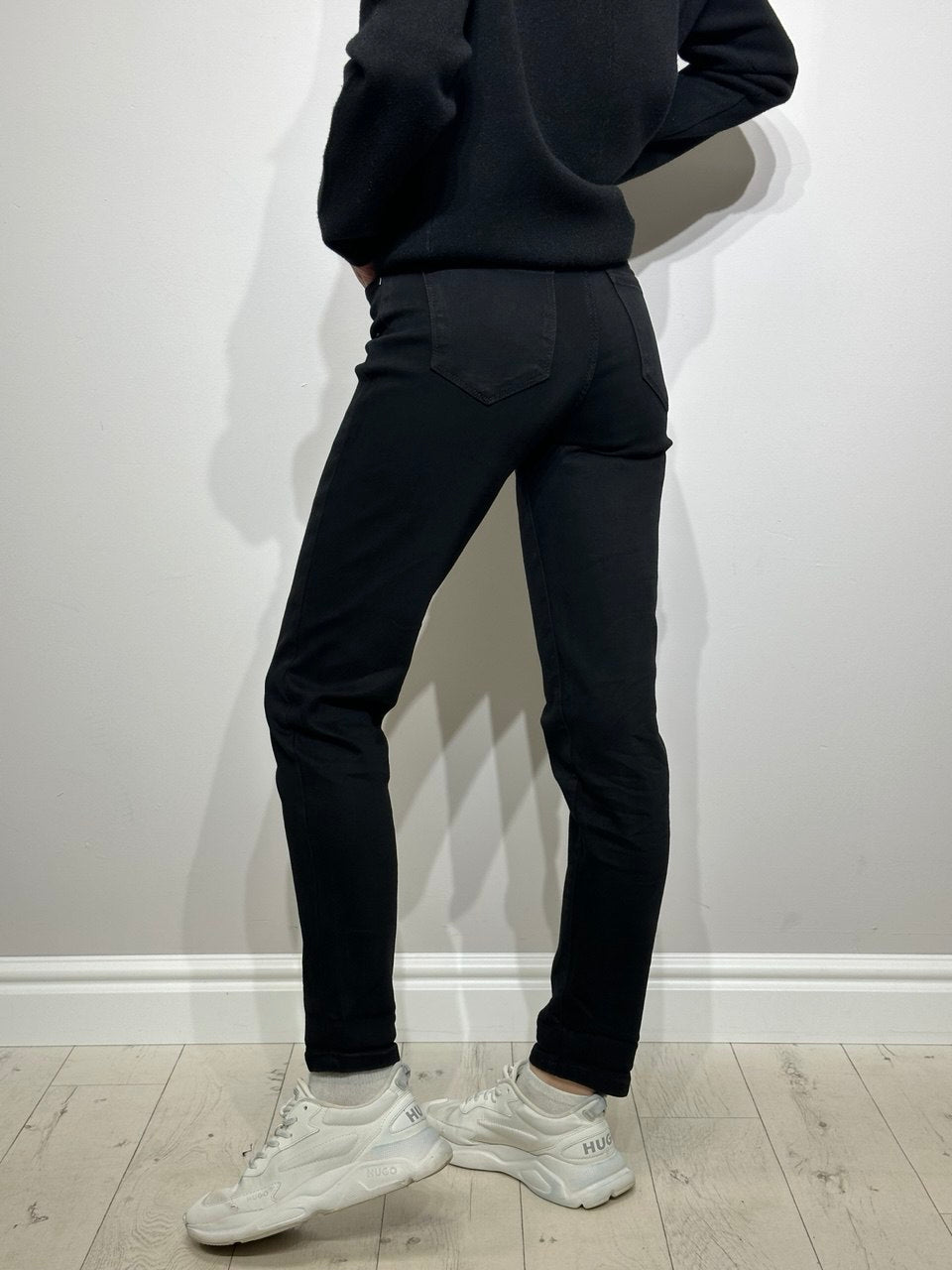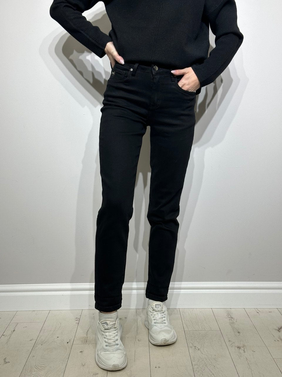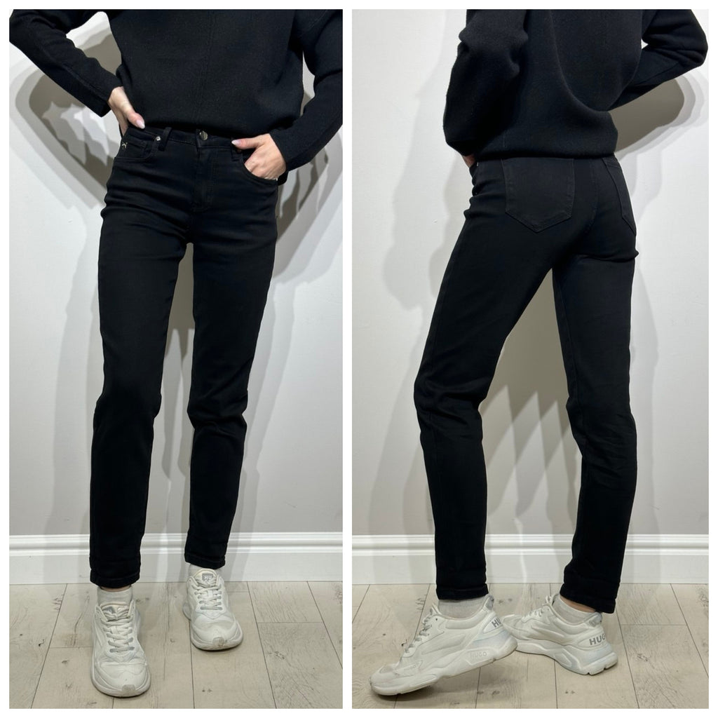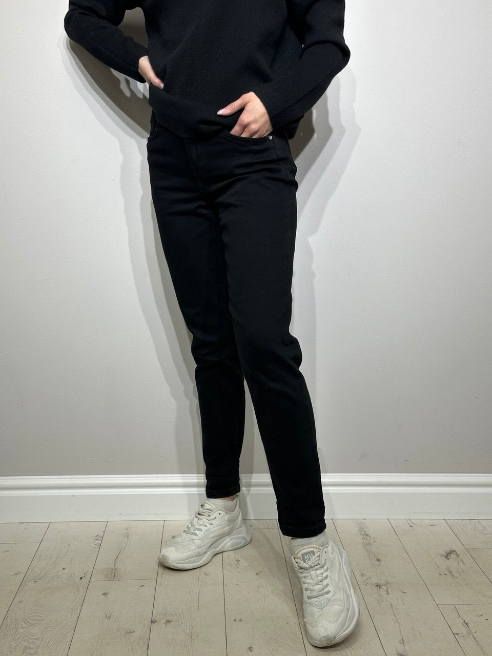 Ērti, melni mom fit džinsi sievietēm, kas nodrošina brīvu, bet sievišķīgu siluetu ikdienas komfortam. Universālais dizains viegli sader ar dažādiem tērpiem, padarot tos par stilīgu izvēli jebkurai dienai.