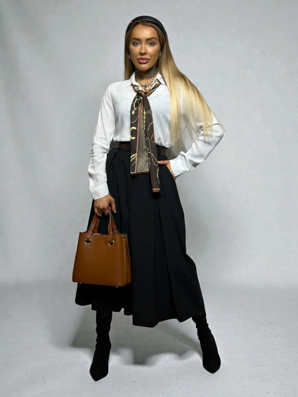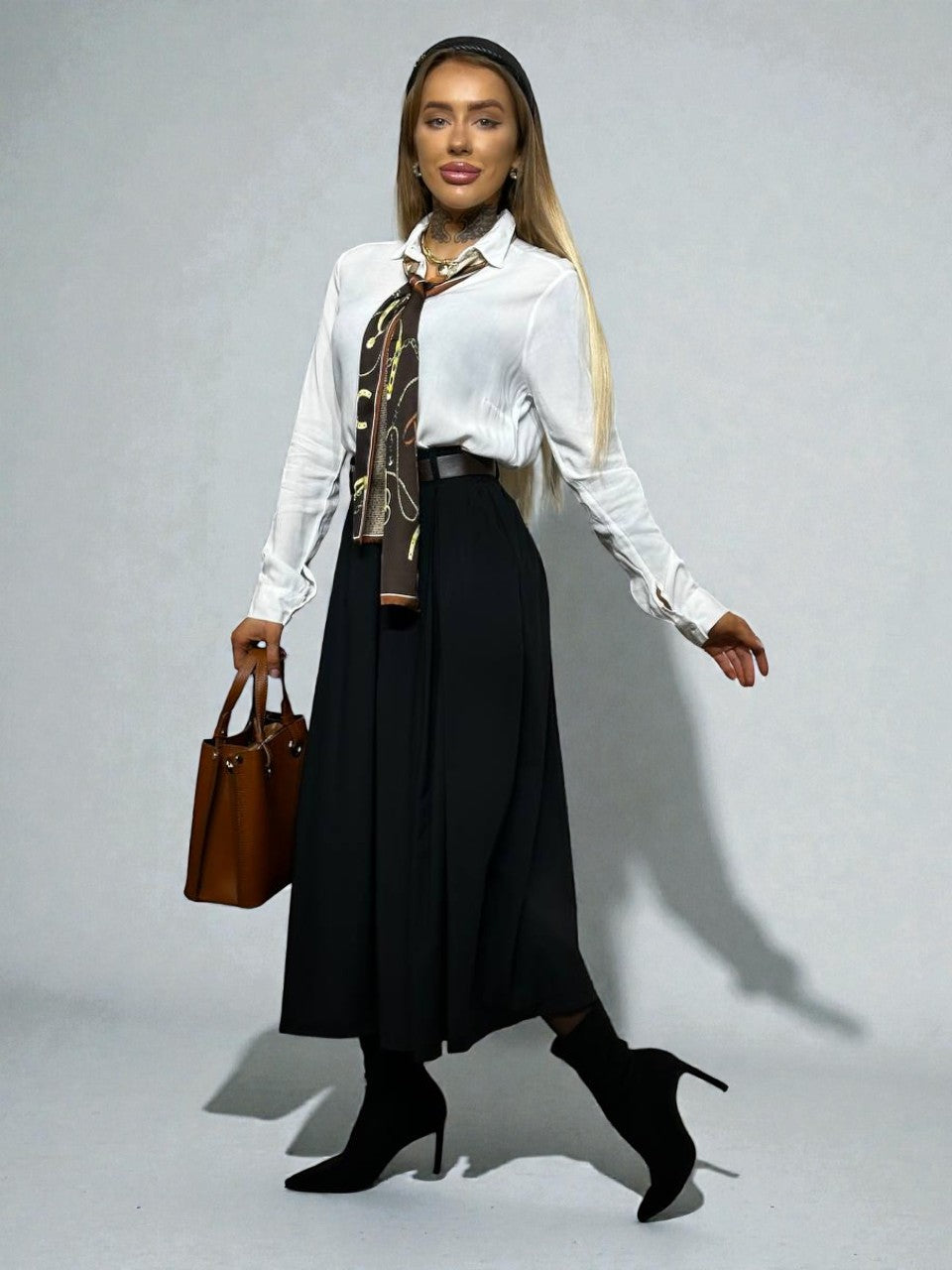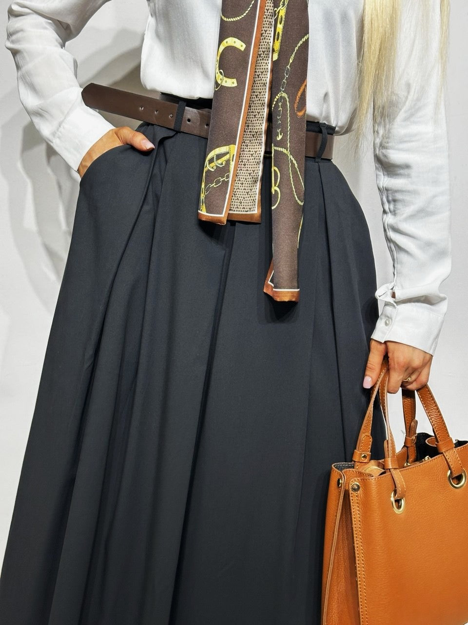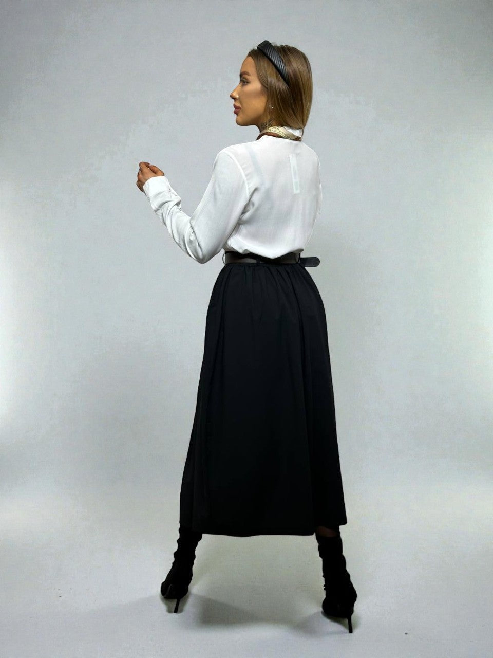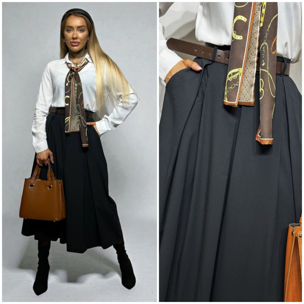 Gari melni svārki,kas izceļ eleganci un pārliecīb. Krītošais audums piešķir siluetam graciozitāti, bet klasiskā melnā krāsa ļauj tos viegli kombinēt gan ikdienas, gan svinīgos tēlos. Universāls un stilīgs apģērba gabals, kas akcentē sievišķību ar minimālistisku izsmalcinātību.