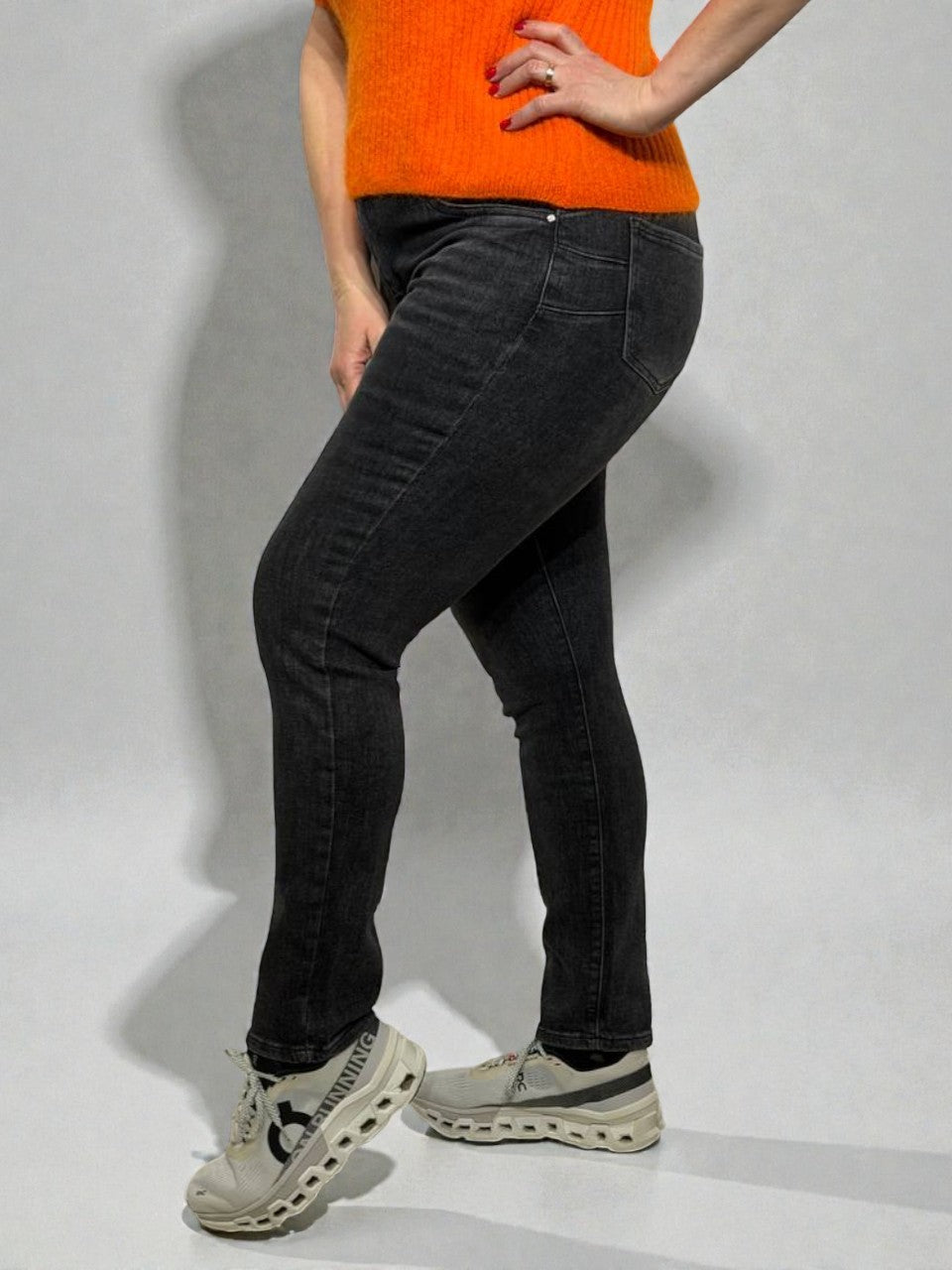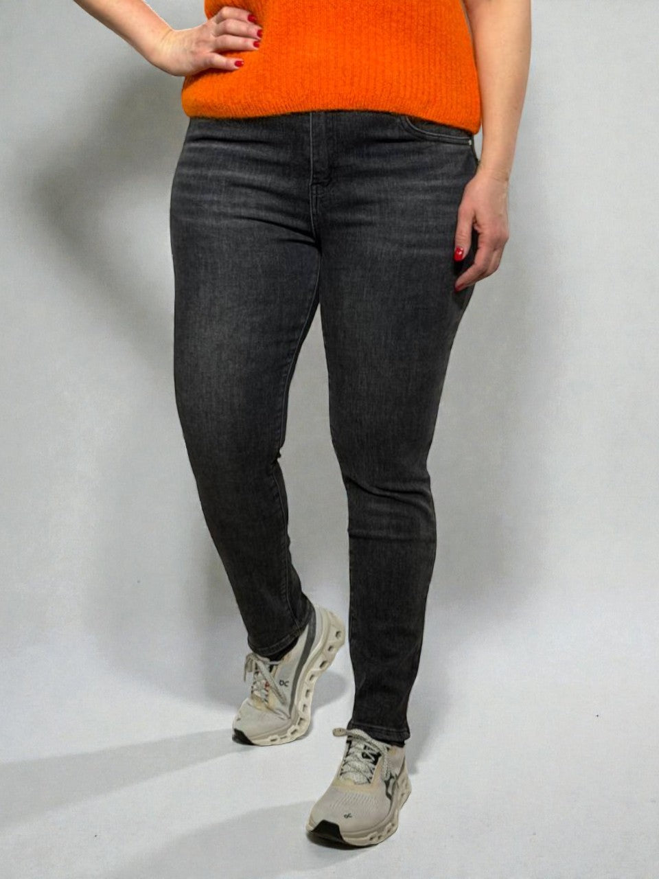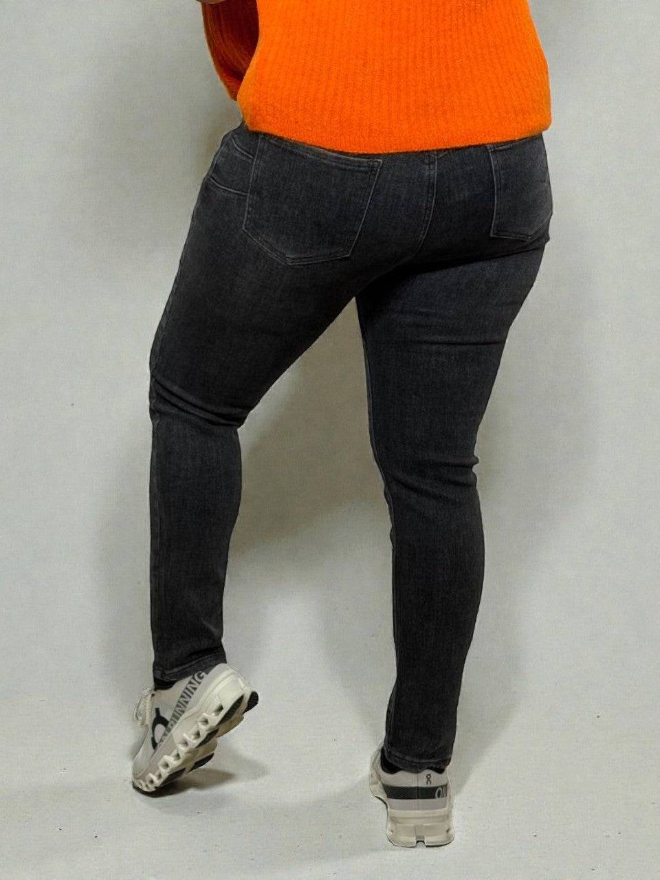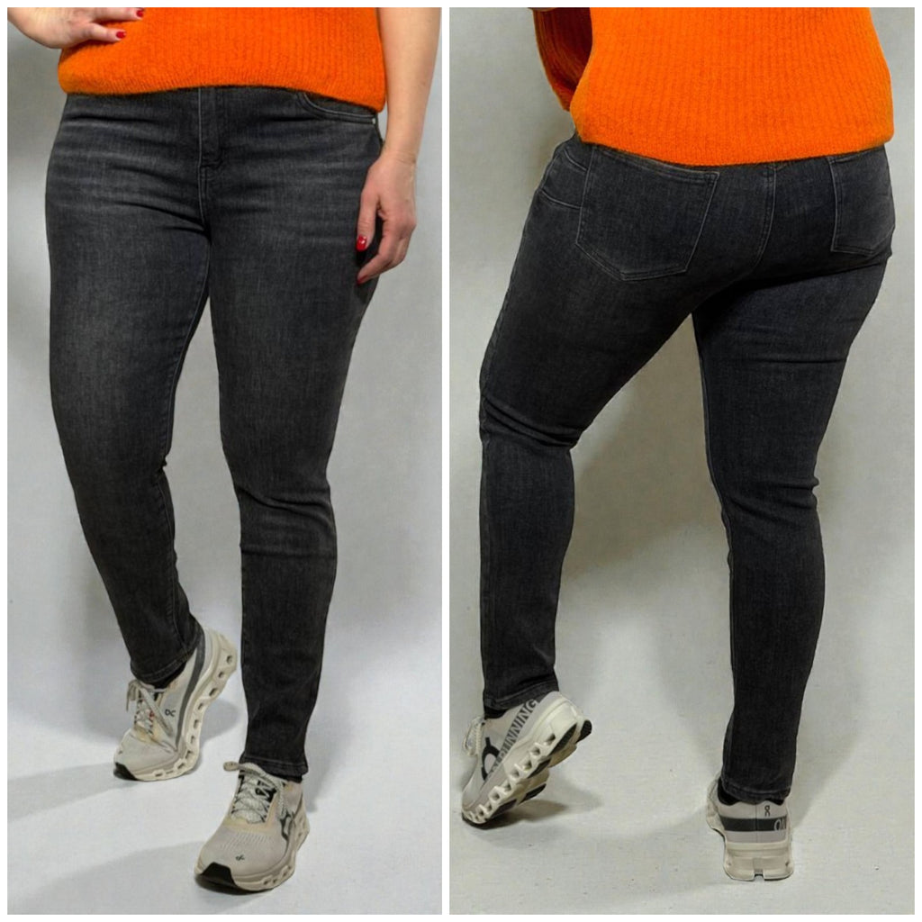 Moderni grafīta krāsas pieguloši džinsi ar push-up efektu, kas izceļ figūru un vizuāli pagarina kājas. Augstā jostasvieta nodrošina ērtu piegulumu un skaisti akcentē vidukli, savukārt elastīgais audums garantē komfortu visas dienas garumā. Klasiskais dizains padara šos džinsus viegli kombinējamus gan ar ikdienas apģērbu, gan elegantākiem tēliem.
