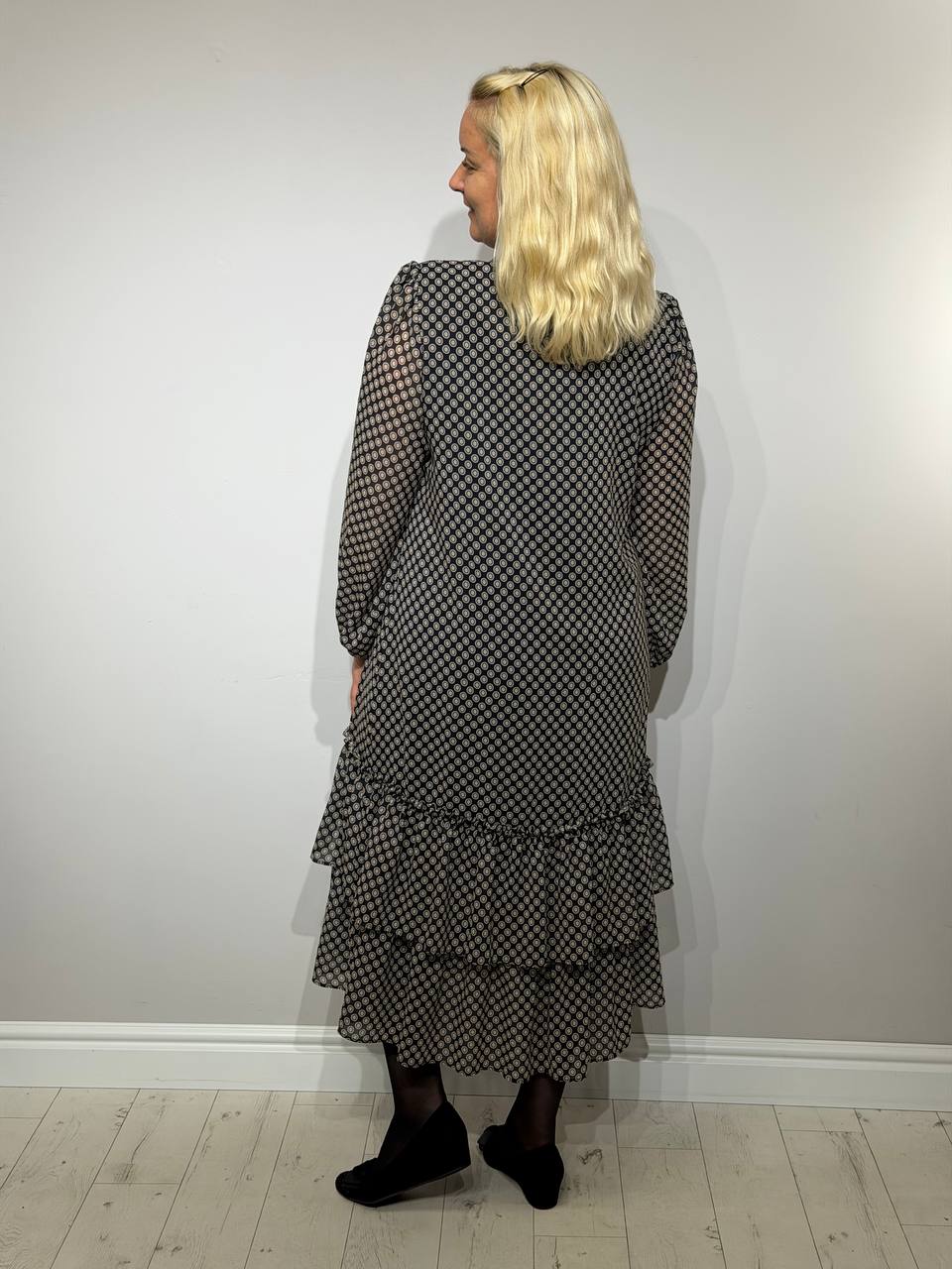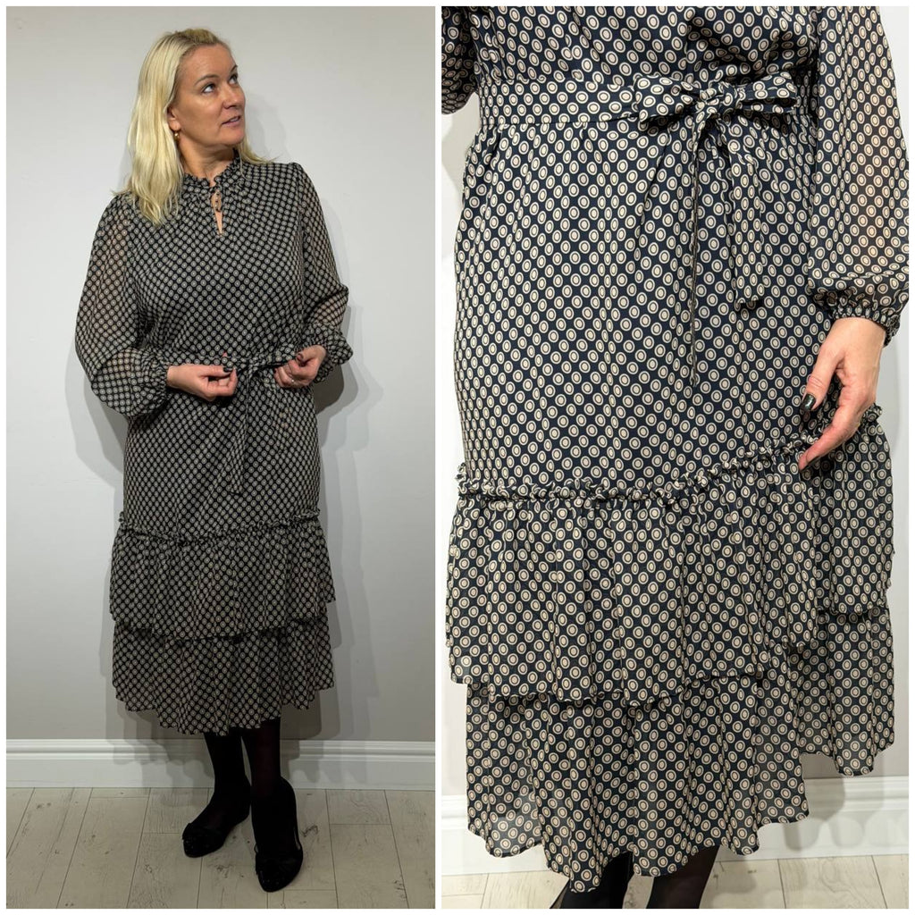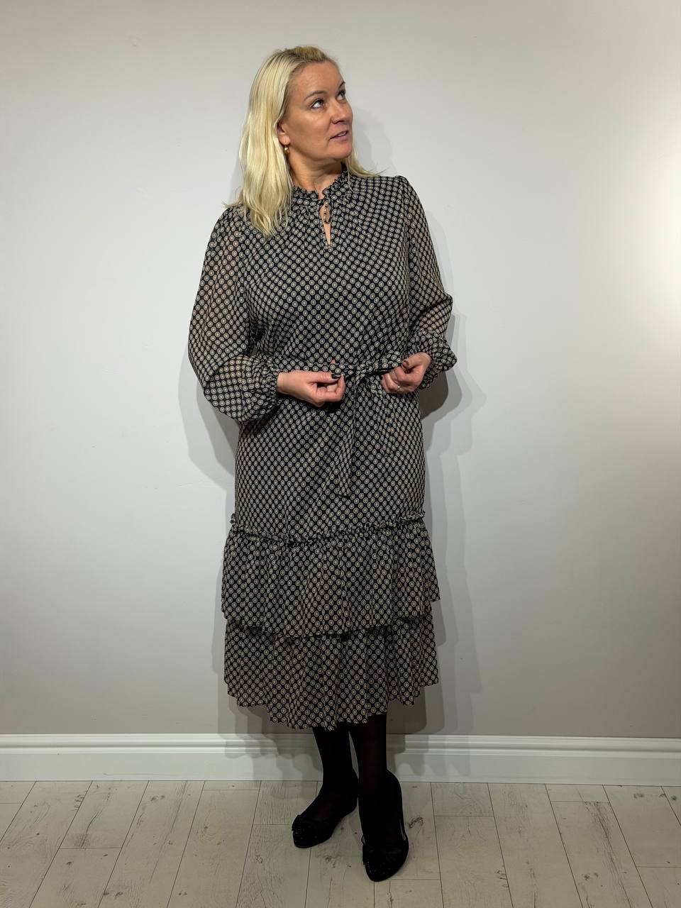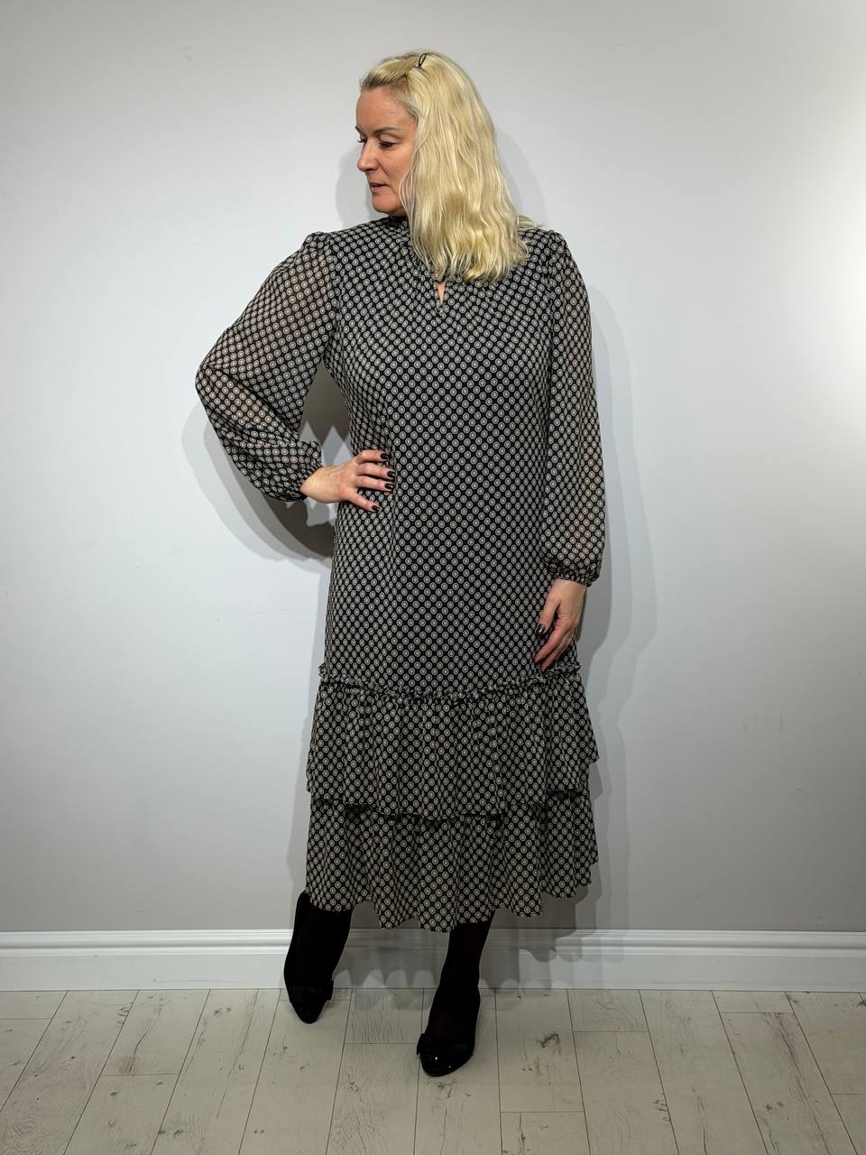 Eleganta un gaisīga kleita ar ģeometrisku rakstu, volānu apakšdaļu un vieglām garajām piedurknēm. Kleita ir patīkama ķermenim, elpojoša un viegli kopjama. Ideāli piemērota gan ikdienai, gan īpašiem gadījumiem.