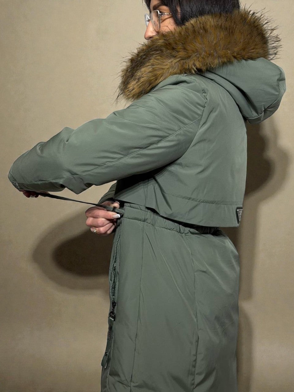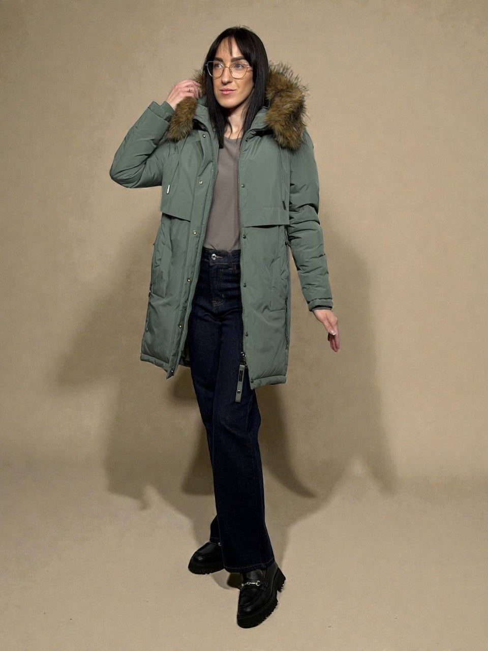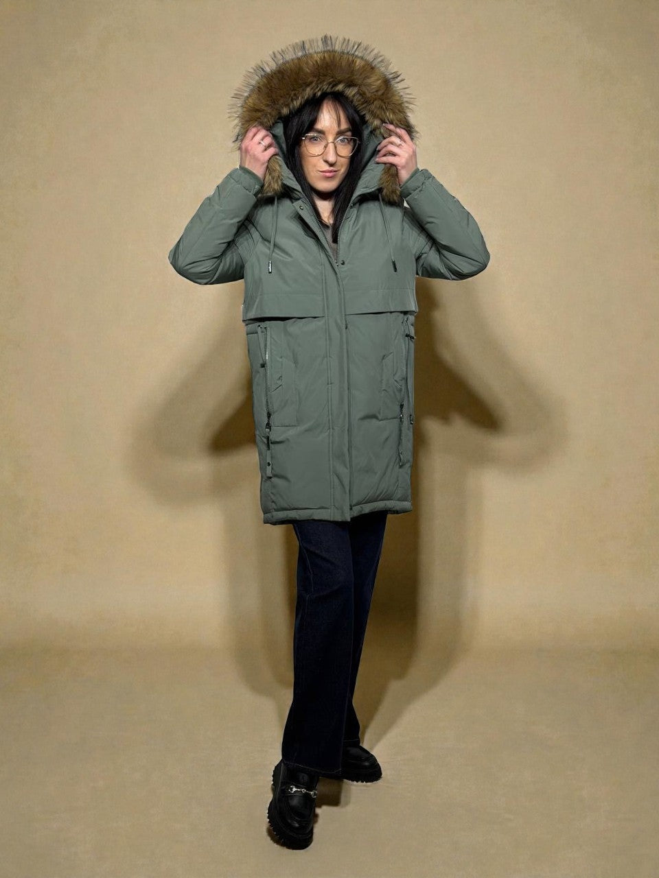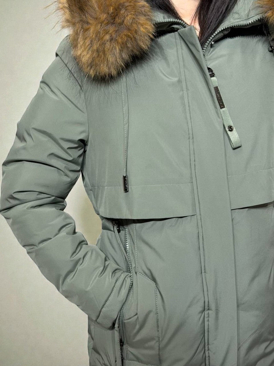 Sieviešu ziemas jaka apvieno siltumu un funkcionalitāti, padarot to par siltu mēteli, kas ideāli piemērots aukstai sezonai. Kapuce ar noņemamu mākslīgās kažokādas maliņu piešķir ziemas apģērbam stilīgu un komfortablu akcentu.