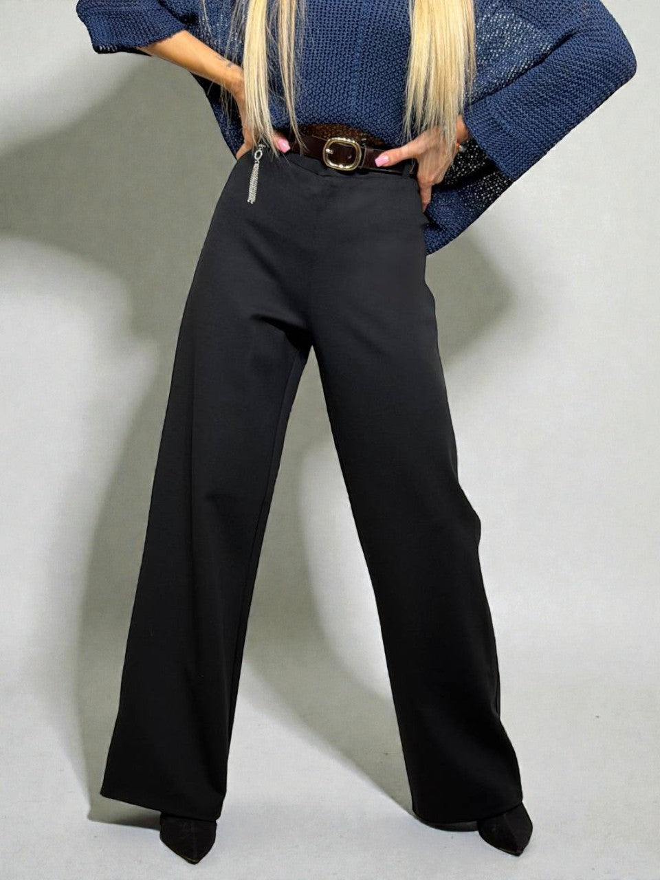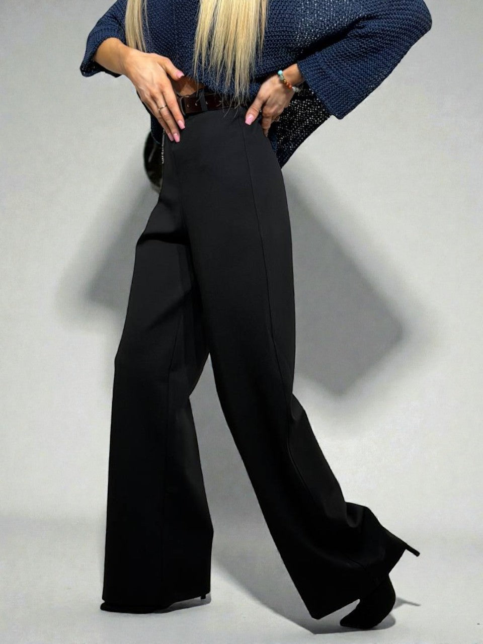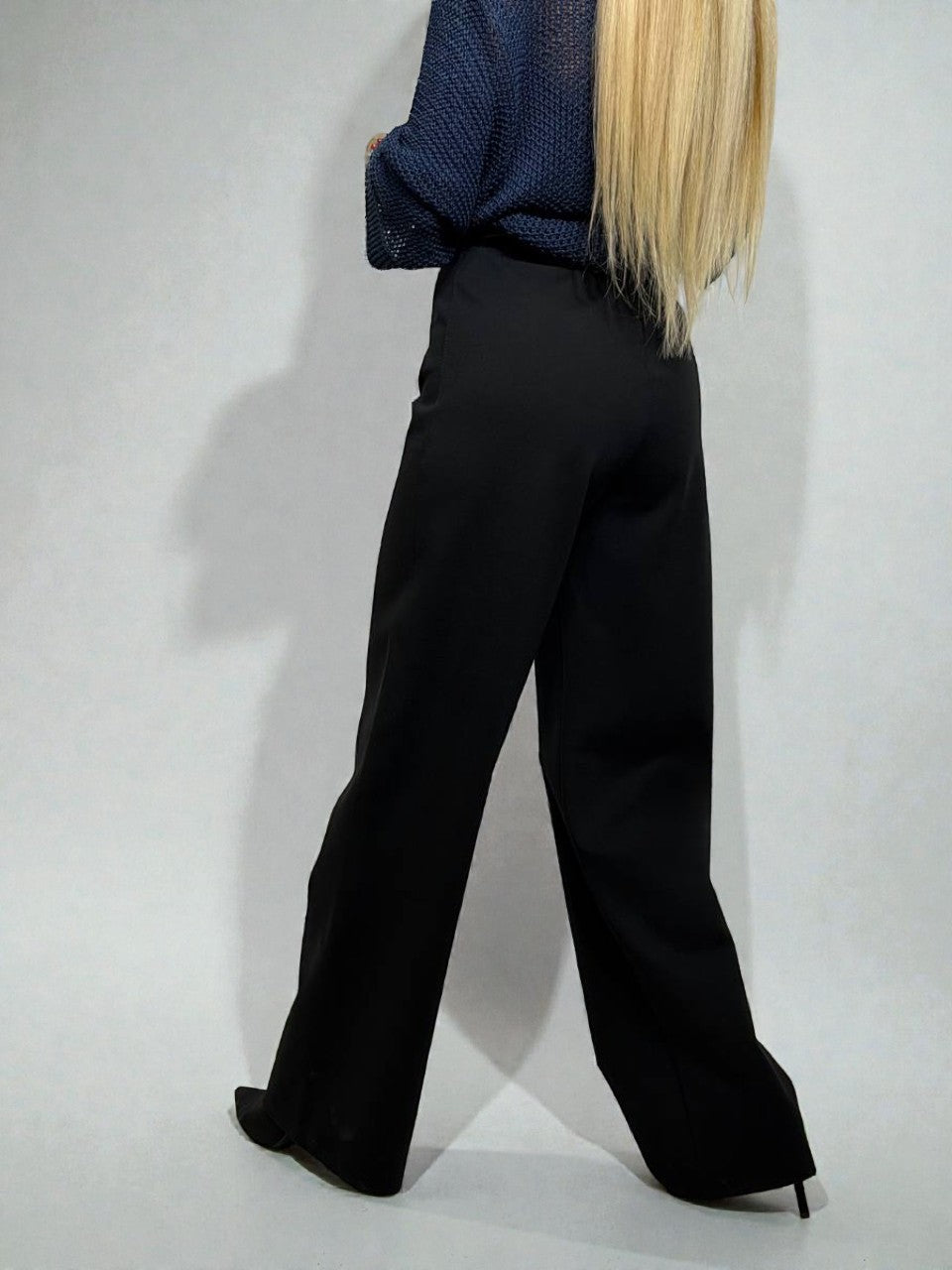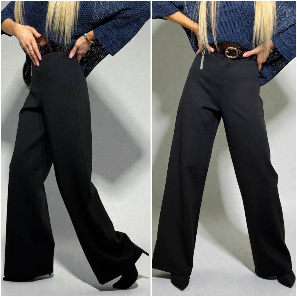 Solīdas bikses stingra auduma nodrošina komfortu un brīvību ikdienā. Taisns siluets, elastīga jostasvieta, nedaudz paplatināti gali, kas ļauj tās viegli kombinēt ar dažādiem ikdienas apģērbiem, gan svinīgākiem tērpiem.