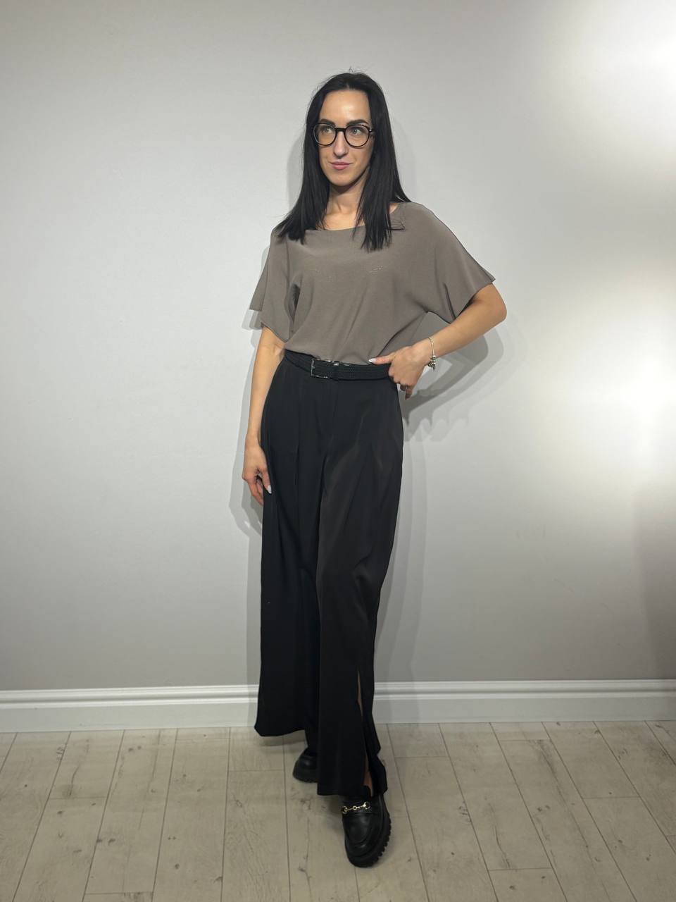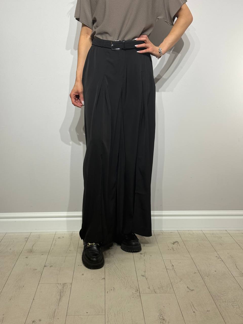 Изысканный и современный элемент гардероба. Текучая ткань создаёт лёгкий силуэт в движении, а высокая талия с поясом подчёркивает талию и обеспечивает комфорт. Боковой разрез придаёт брюкам женственный акцент и свободу движений, делая их отличным выбором как для повседневного стиля, так и для особых случаев.