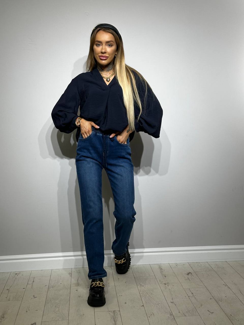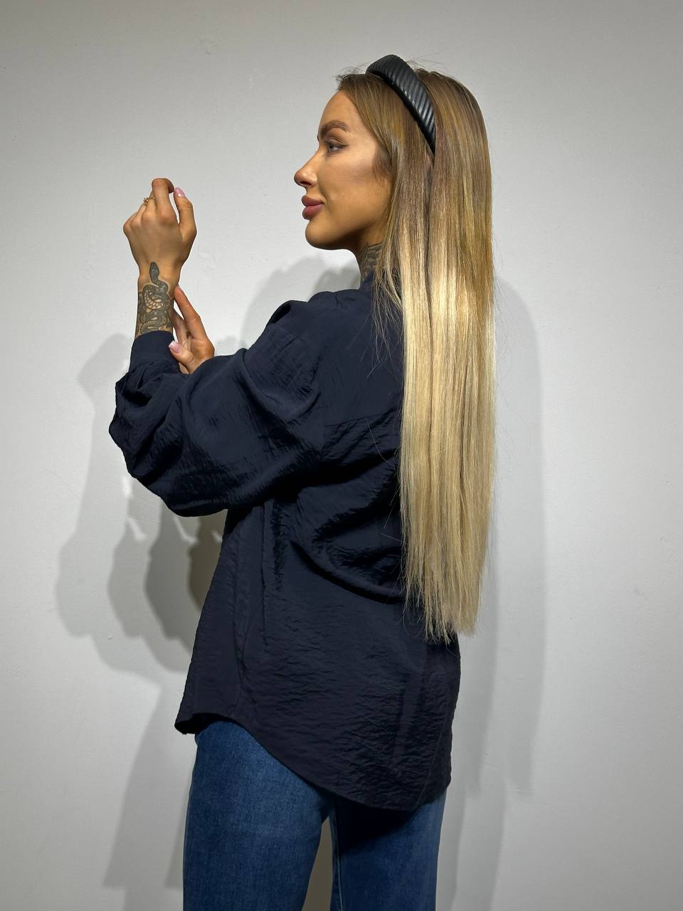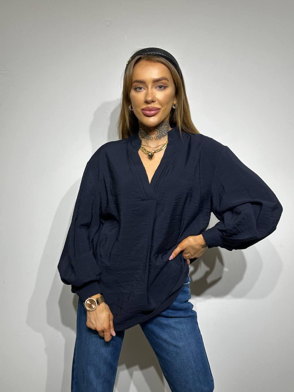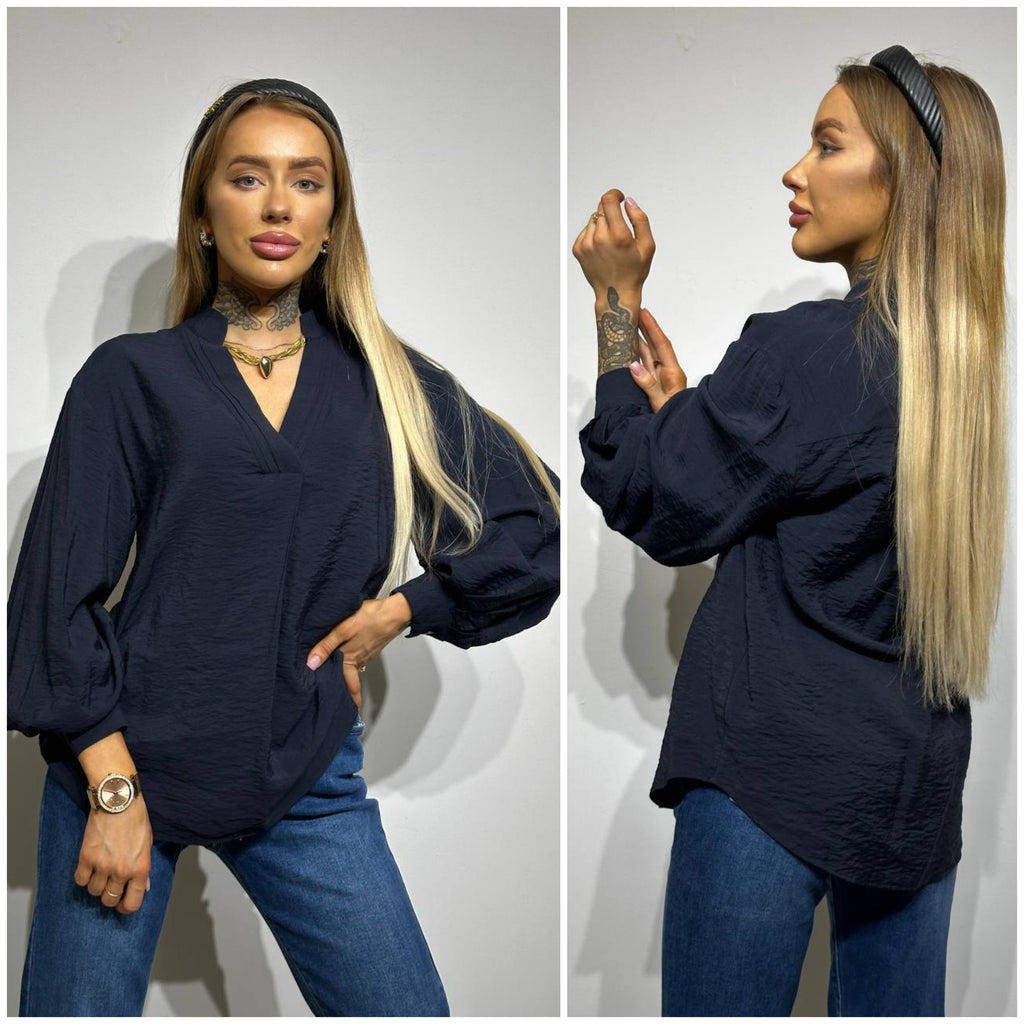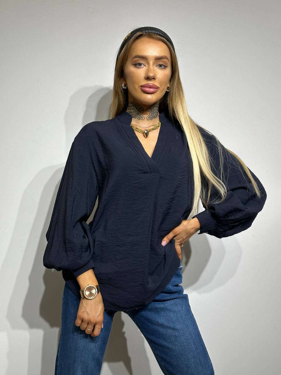 Стильная темно-синяя блузка, легко сочетается как с брюками, так и с юбками